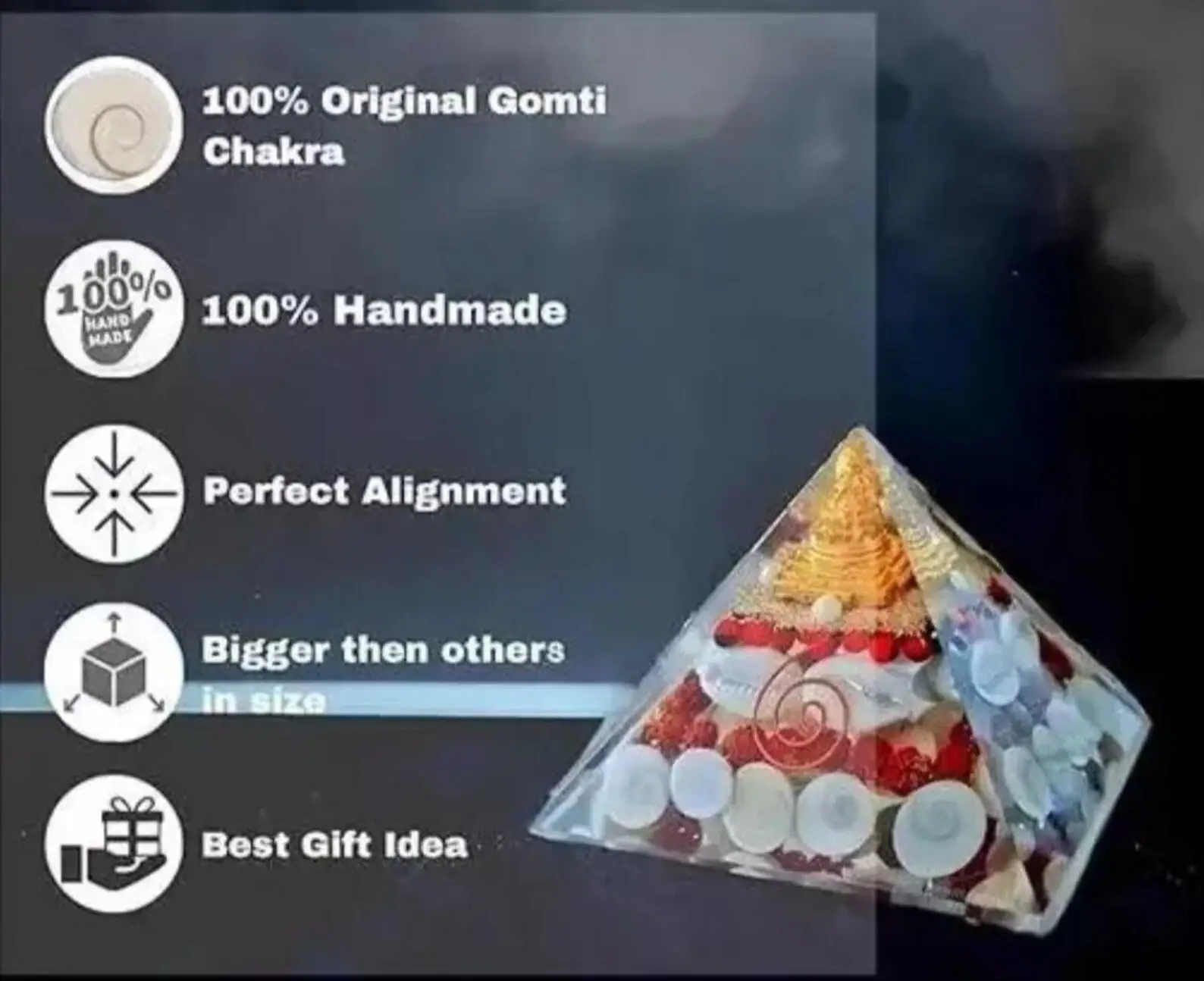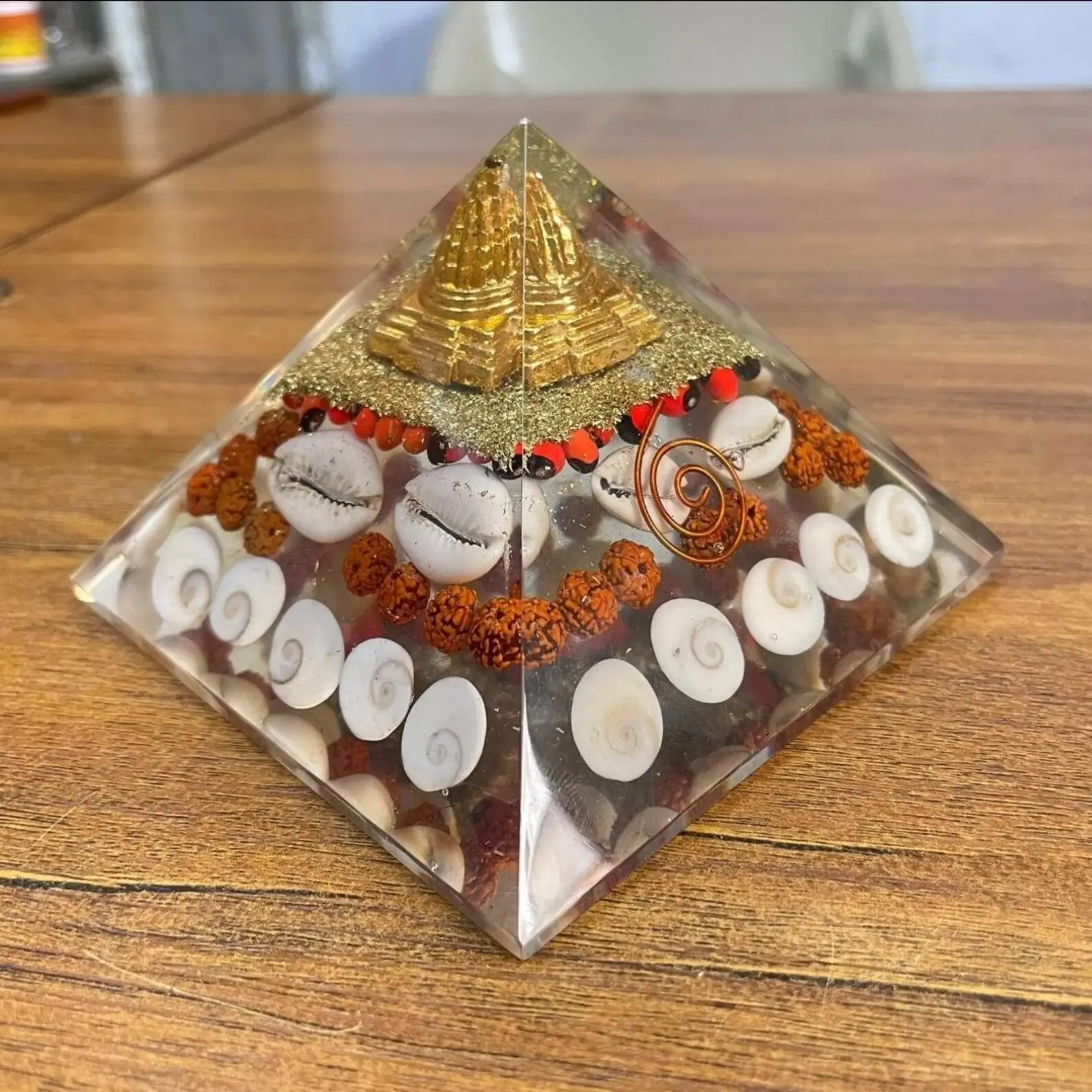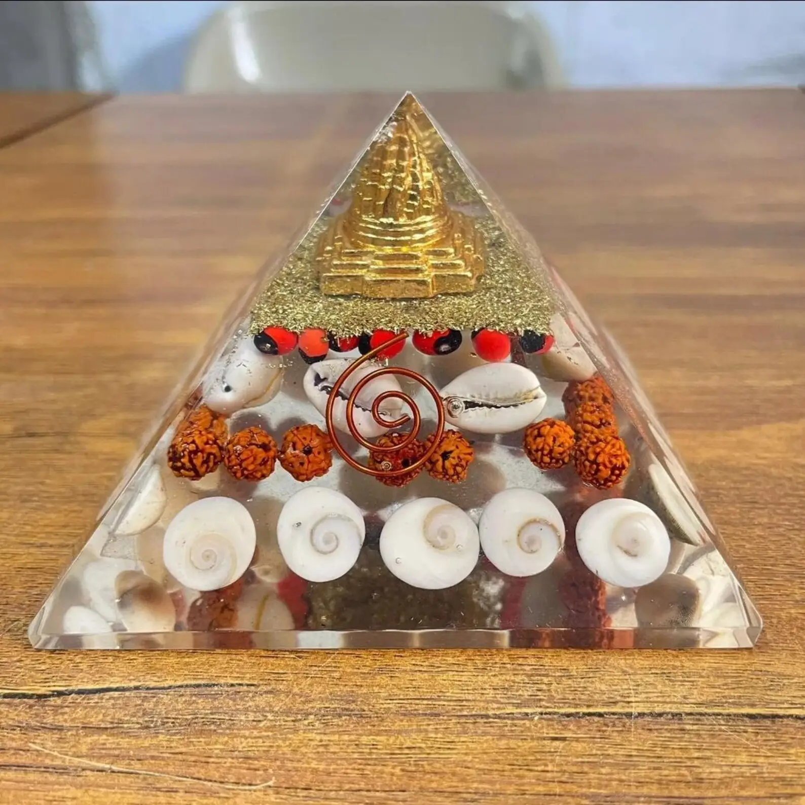 Crafted in India with meticulous care, the pyramid features a blend of Gemstones such as Ratti, White Kaudi, Rudraksha, Gomti Chakra, Copper Coil, and Shree Yantra, known for their healing properties and electromagnetic field protection. It’s a non-custom, handmade item that brings the essence of traditional knowledge into your modern space. Whether it’s your bedroom, bathroom, or any other space, this pyramid is designed to offer a serene ambiance wherever you need it.