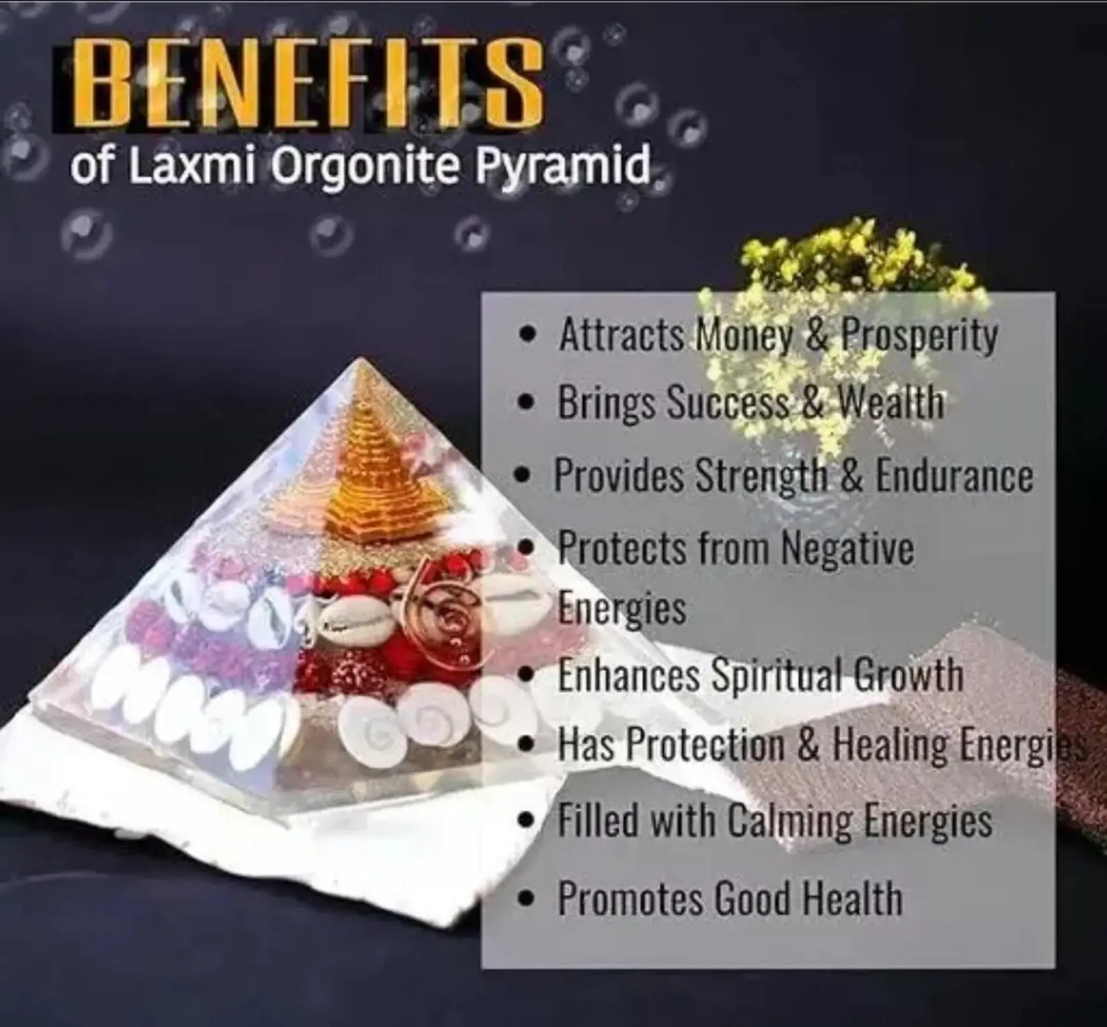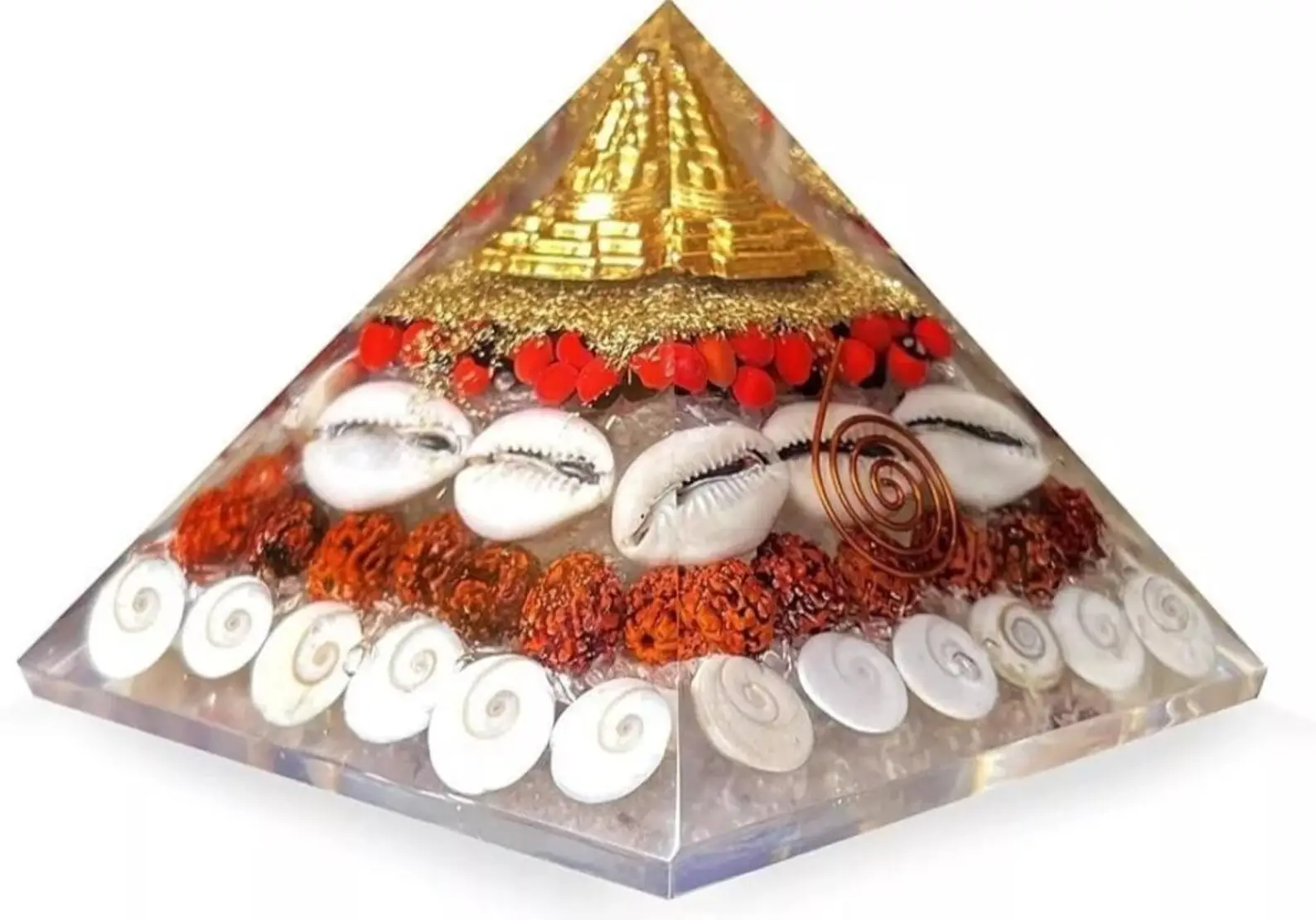 Explore the mystical realms of healing and protection with our Large Gomti Orgonite Mahalaxmi Pyramid. A masterpiece blended with the spiritual significance of Hinduism, this multicoloured pyramid is a contemporary piece that resonates with the natural energy of its components. It’s a standalone unit that can be placed in any room, serving as a vibrant reminder of the balance and harmony it represents.